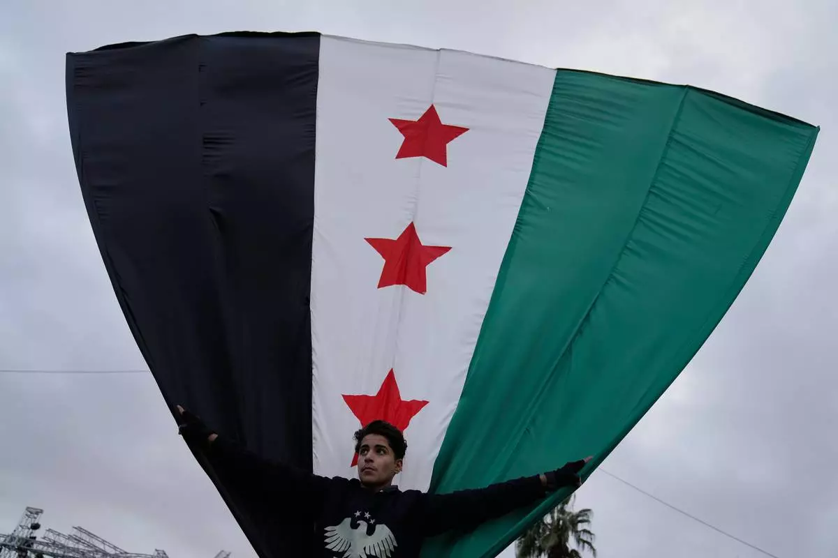 A Syrian man waves his country flag during celebrations marking the first anniversary of the ousting of former President Bashar Assad in Damascus, Syria, Monday, Dec. 8, 2025. (AP Photo/Hussein Malla)