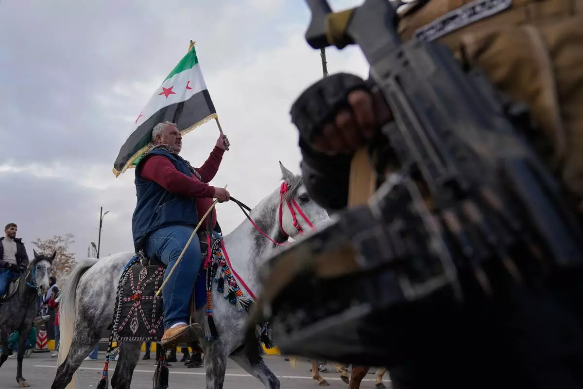 In this photo provided by the Ukrainian Emergency Services on Monday, Dec. 8, 2025, a rescue worker puts out a fire of a residential building damaged by a Russian strike in Sumy region, Ukraine. (Ukrainian Emergency Service via AP)