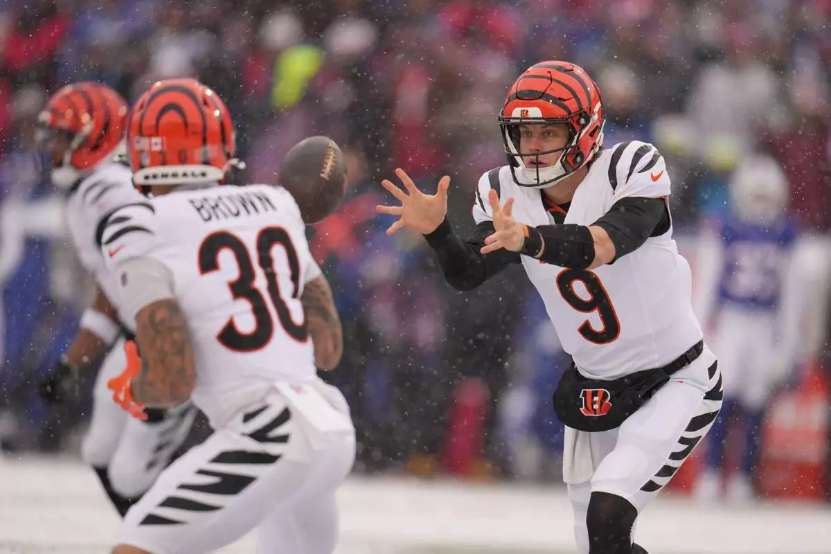 Cincinnati Bengals quarterback Joe Burrow (9) shovels the ball during the first half of an NFL football game against the Buffalo Bills, Sunday, Dec. 7, 2025, in Orchard Park, N.Y. (AP Photo/Gene J. Puskar)