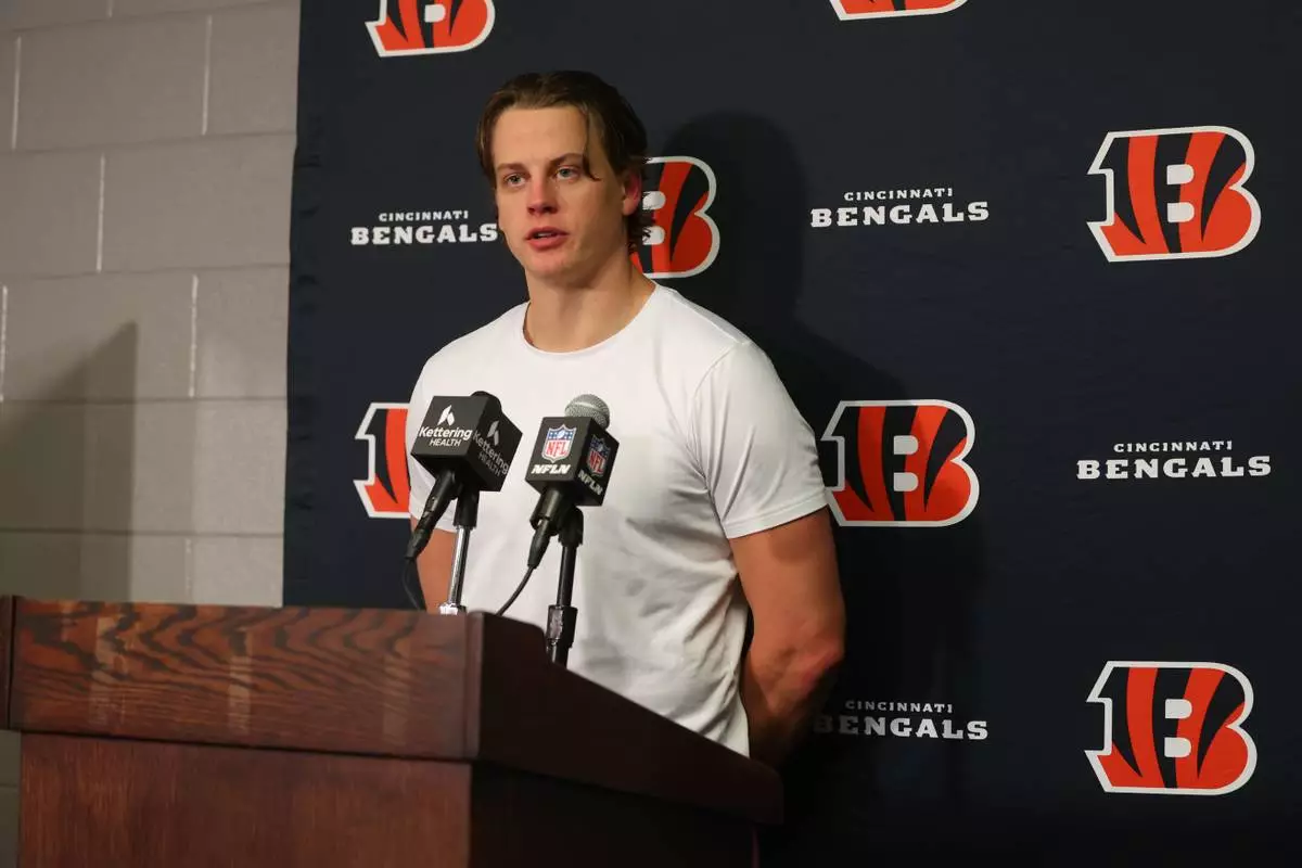 Cincinnati Bengals quarterback Joe Burrow speaks during a news conference after an NFL football game against the Buffalo Bills, Sunday, Dec. 7, 2025, in Orchard Park, N.Y. (AP Photo/Jeffrey T. Barnes)