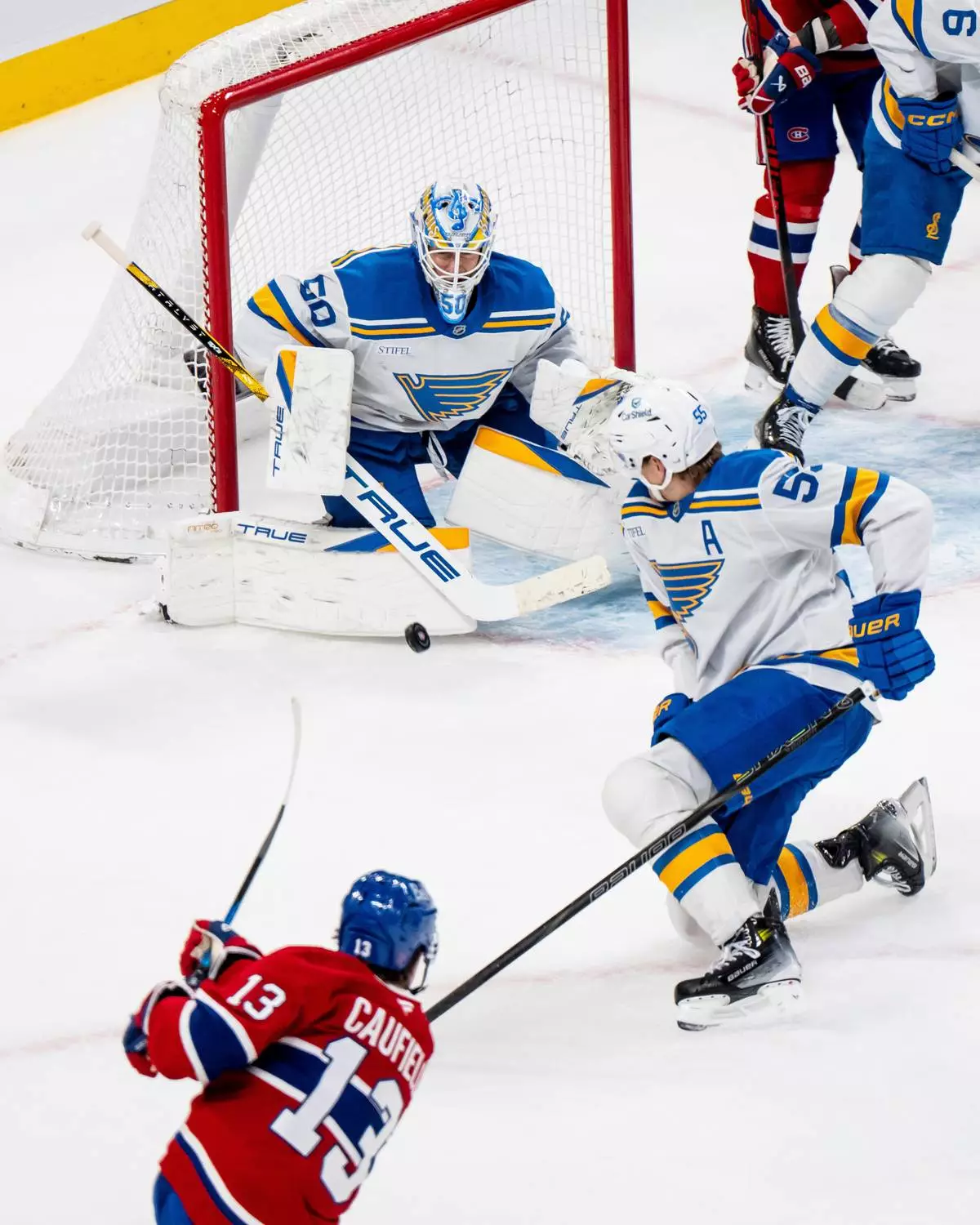 St. Louis Blues goaltender Jordan Binnington (50) makes a save on Montreal Canadiens' Cole Caufield (13) while Blues' Colton Parayko (55) defends during the third period of an NHL hockey game, in Montreal, Sunday, Dec. 7, 2025. (Christopher Katsarov/The Canadian Press via AP)