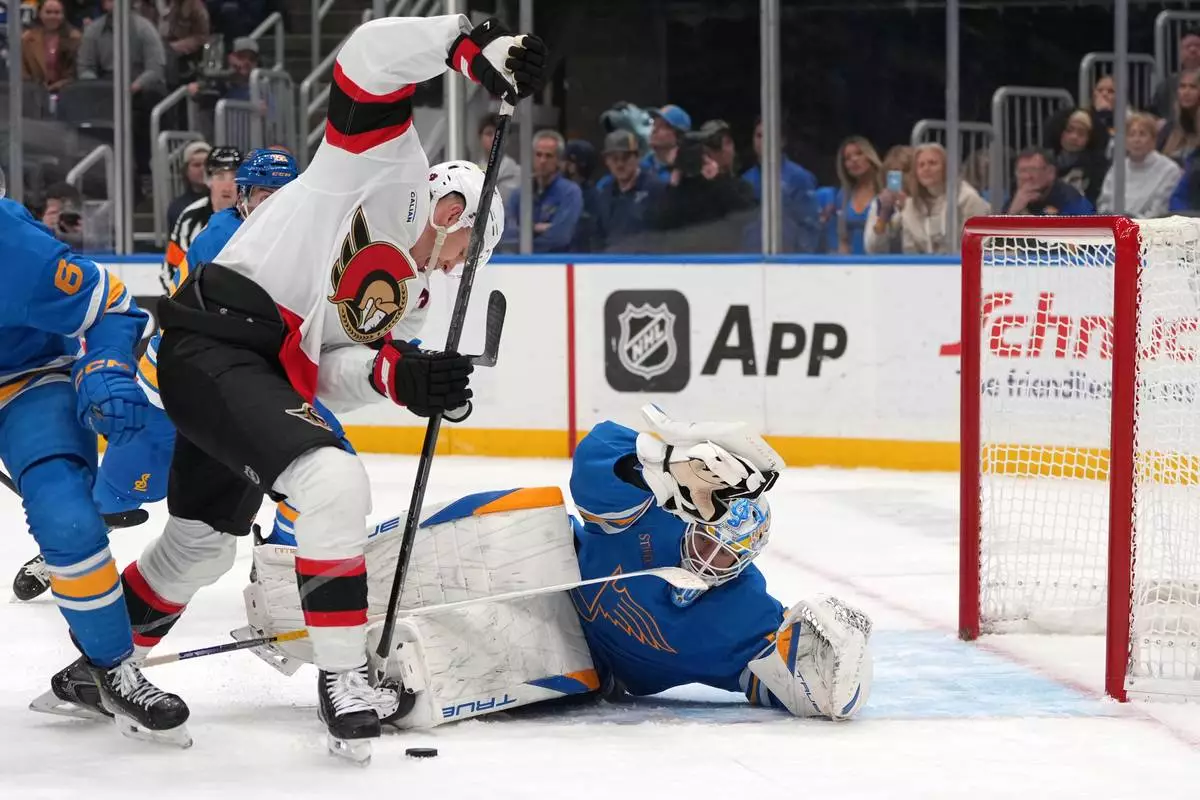 Ottawa Senators' Brady Tkachuk, left, is unable to score past St. Louis Blues goaltender Jordan Binnington during the third period of an NHL hockey game Friday, Nov. 28, 2025, in St. Louis. (AP Photo/Jeff Roberson)