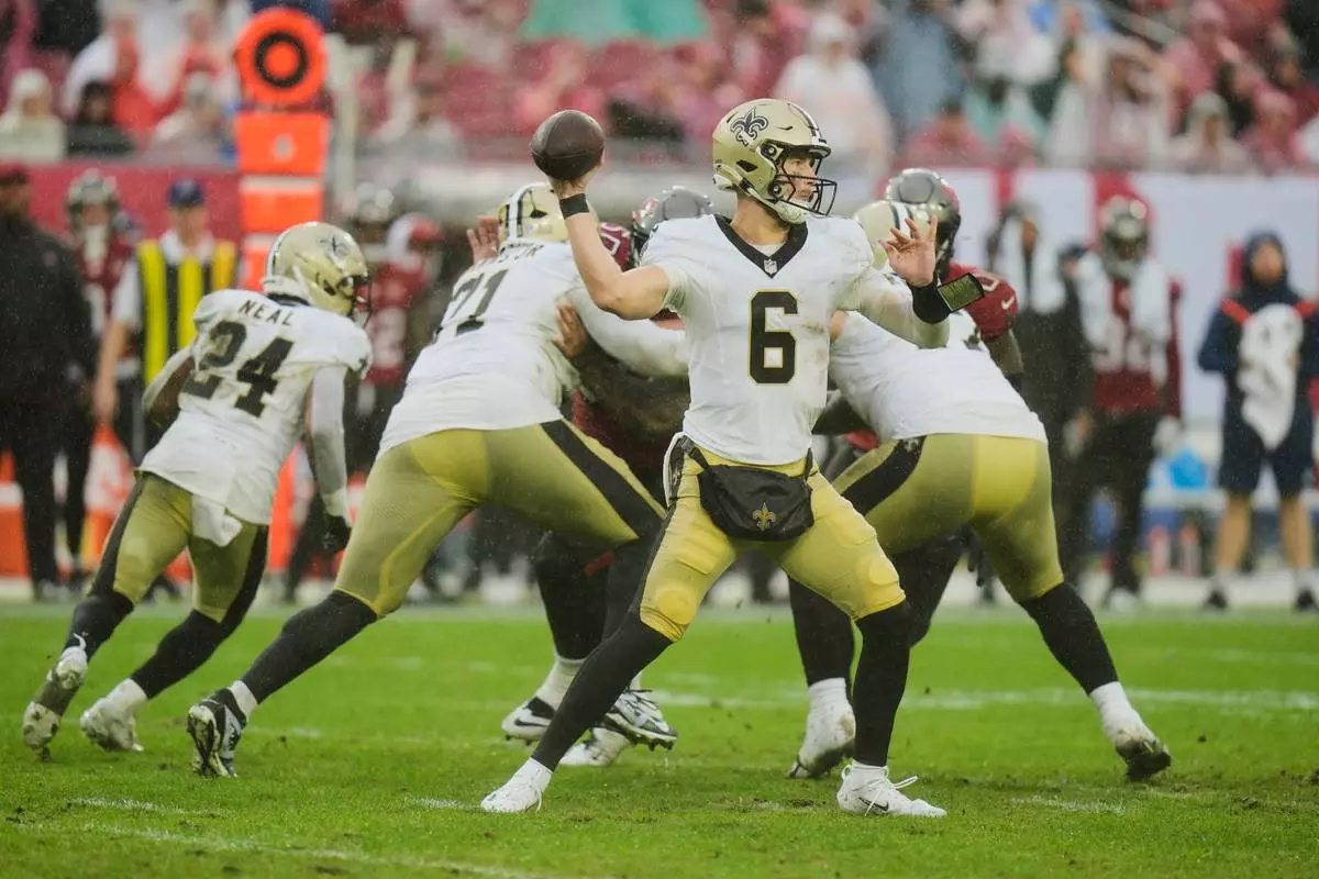 New Orleans Saints quarterback Tyler Shough (6) passes against the Tampa Bay Buccaneers in the second half of an NFL football game, Sunday, Dec. 7, 2025, in Tampa, Fla. (AP Photo/Chris O'Meara)