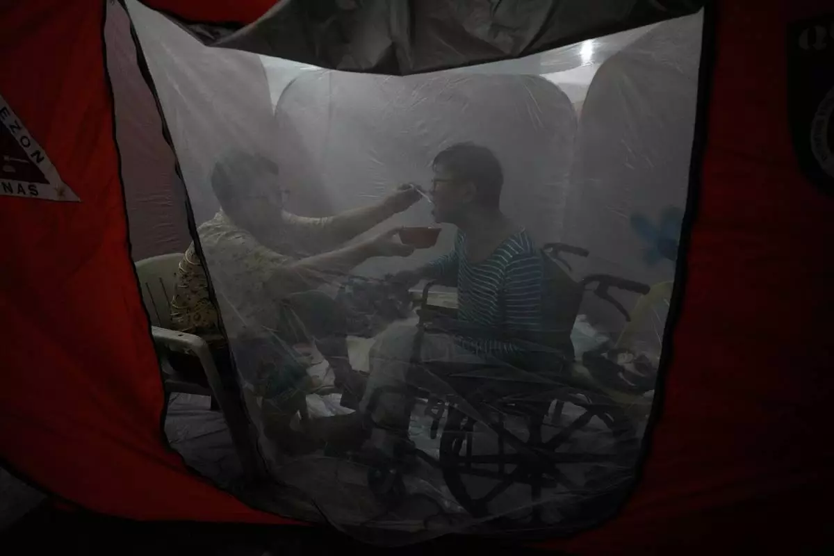Judy Bertuso, left, feeds her husband Apollo inside a tent at an evacuation center as Typhoon Fung-wong enters the country on Sunday, Nov. 9, 2025 in Quezon city, Philippines. (AP Photo/Aaron Favila, File)
