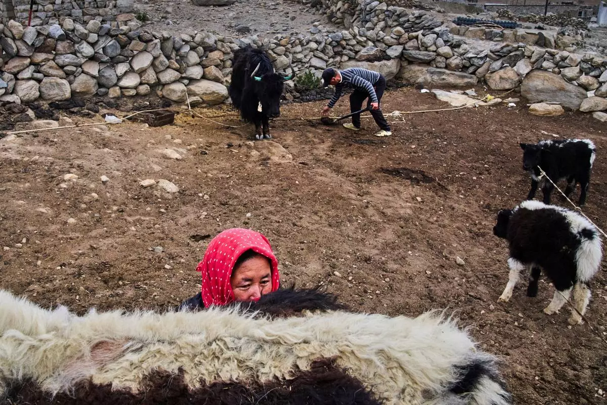 Tanzin Dolma milks a yak as her husband, Punchuk Namdol, collects yak dung in the background on an early morning in Maan village, Ladakh, India, Tuesday, July 8, 2025. (AP Photo/Dar Yasin, File)