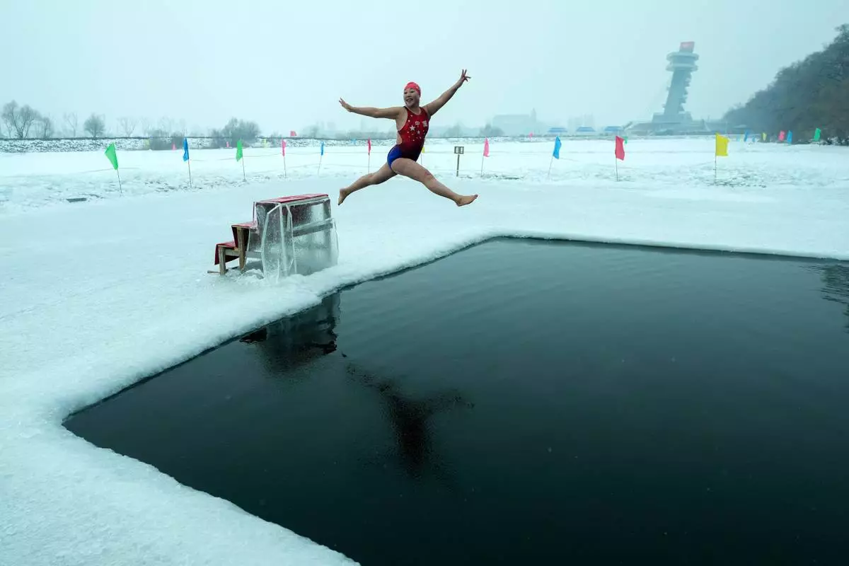 Yu Xiaofeng leaps as she jumps into a pool carved from ice on the frozen Songhua river in Harbin in northeastern China's Heilongjiang province, Tuesday, Jan. 7, 2025. (AP Photo/Andy Wong, File)