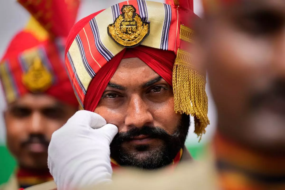 A Sikh paramilitary soldier adjusts his moustache before taking part in a parade during the country's Independence Day celebrations in Guwahati, India, Friday, Aug. 15, 2025. (AP Photo/Anupam Nath, File)