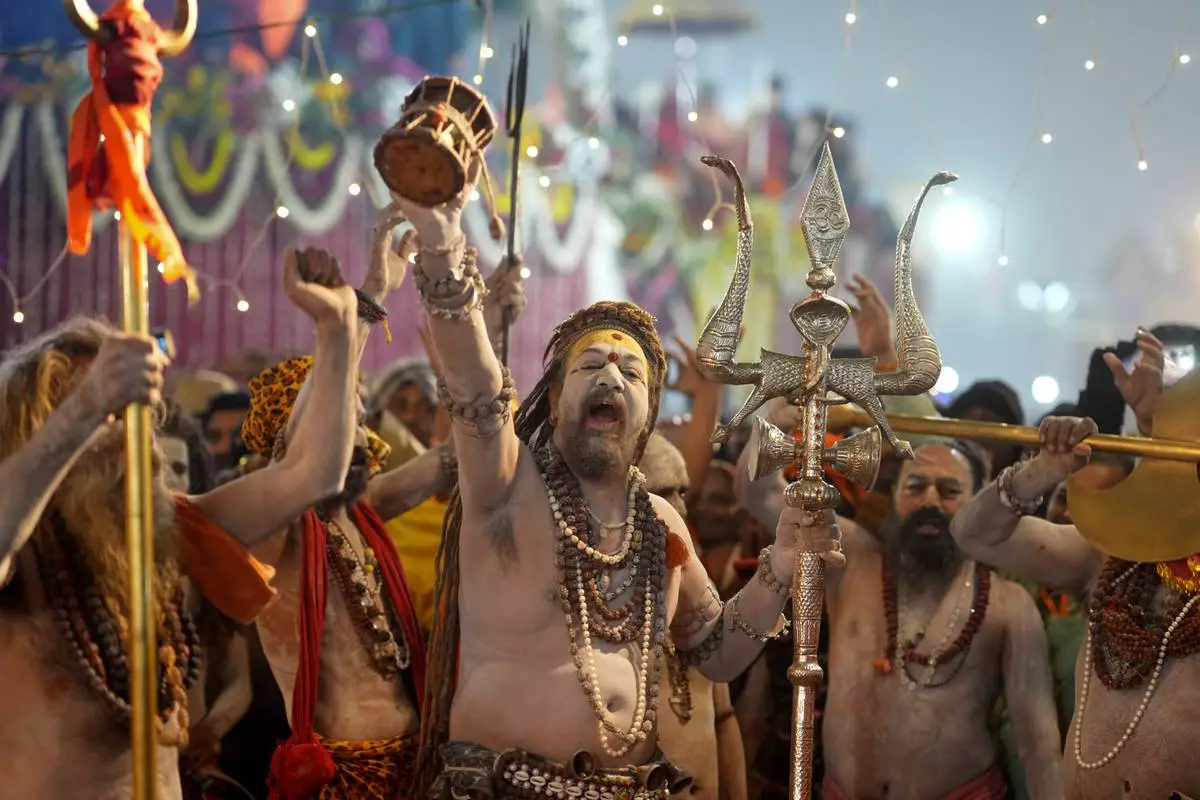 Swami Bhupender Giri, a Naga Sadhu from the Niranjani Akhara, arrives for ritualistic dip at Sangam, the confluence of the Rivers Ganges, Yamuna and mythical Saraswati, on the auspicious Makar Sankranti day during the Maha Kumbh festival, which is one of the world's largest religious gatherings, in Prayagraj, in the northern Indian state of Uttar Pradesh, India, Tuesday, Jan. 14, 2025. (AP Photo/Rajesh Kumar Singh, file)
