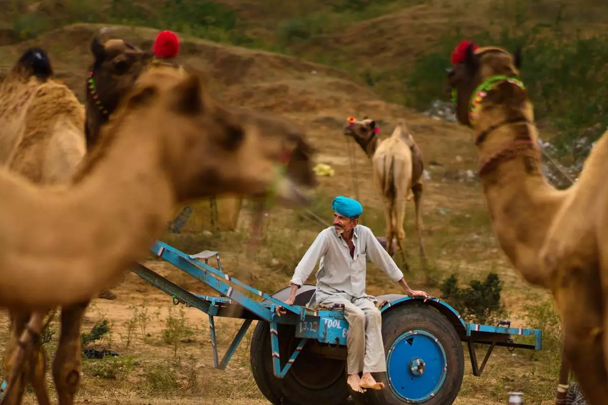 A camel herder sits near cattle at the annual cattle fair in Pushkar, in the western Indian state of Rajasthan, Wednesday, Oct. 29, 2025. (AP Photo/Rajesh Kumar Singh, File)