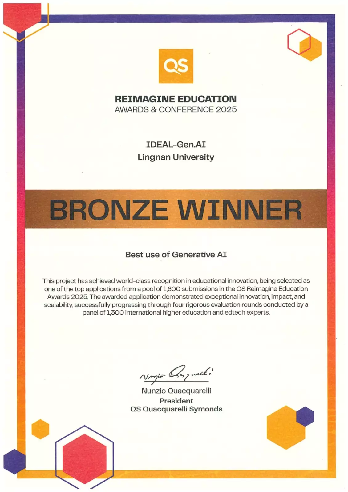 Lingnan’s IDEAL-Gen.AI Platform is awarded the Bronze Award in the “Best Use of AI” category.