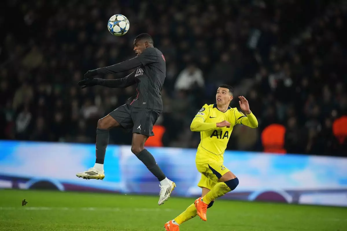 PSG's Ousmane Dembele heads the ball during a Champions League opening phase soccer match between Paris Saint Germain and Tottenham, in Paris, Wednesday, Nov.26, 2025. (AP Photo/Christophe Ena)