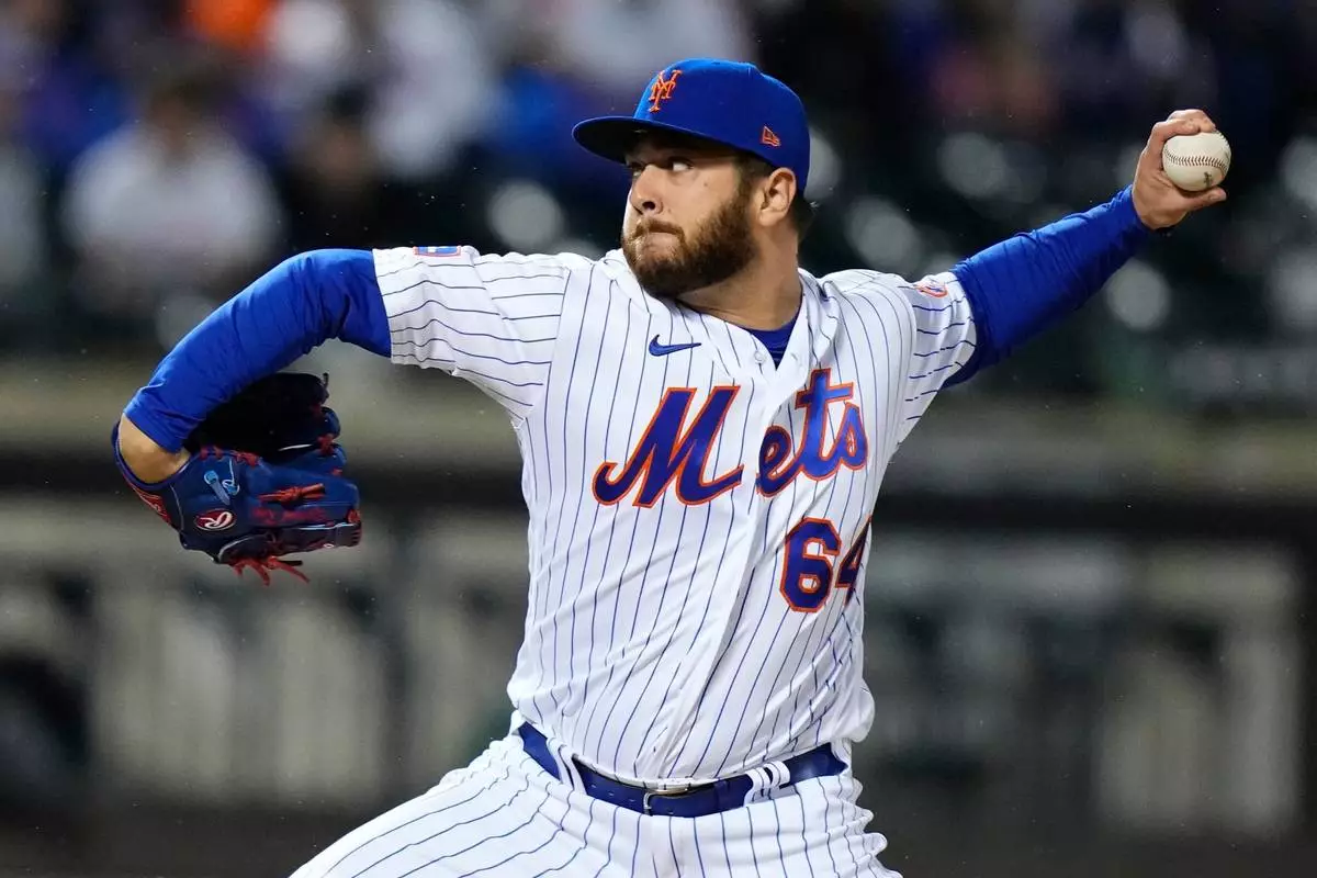 FILE - New York Mets' Anthony Kay (64) pitches during the ninth inning of a baseball game against the Miami MarlinsThursday, Sept. 28, 2023, in New York. (AP Photo/Frank Franklin II, File)