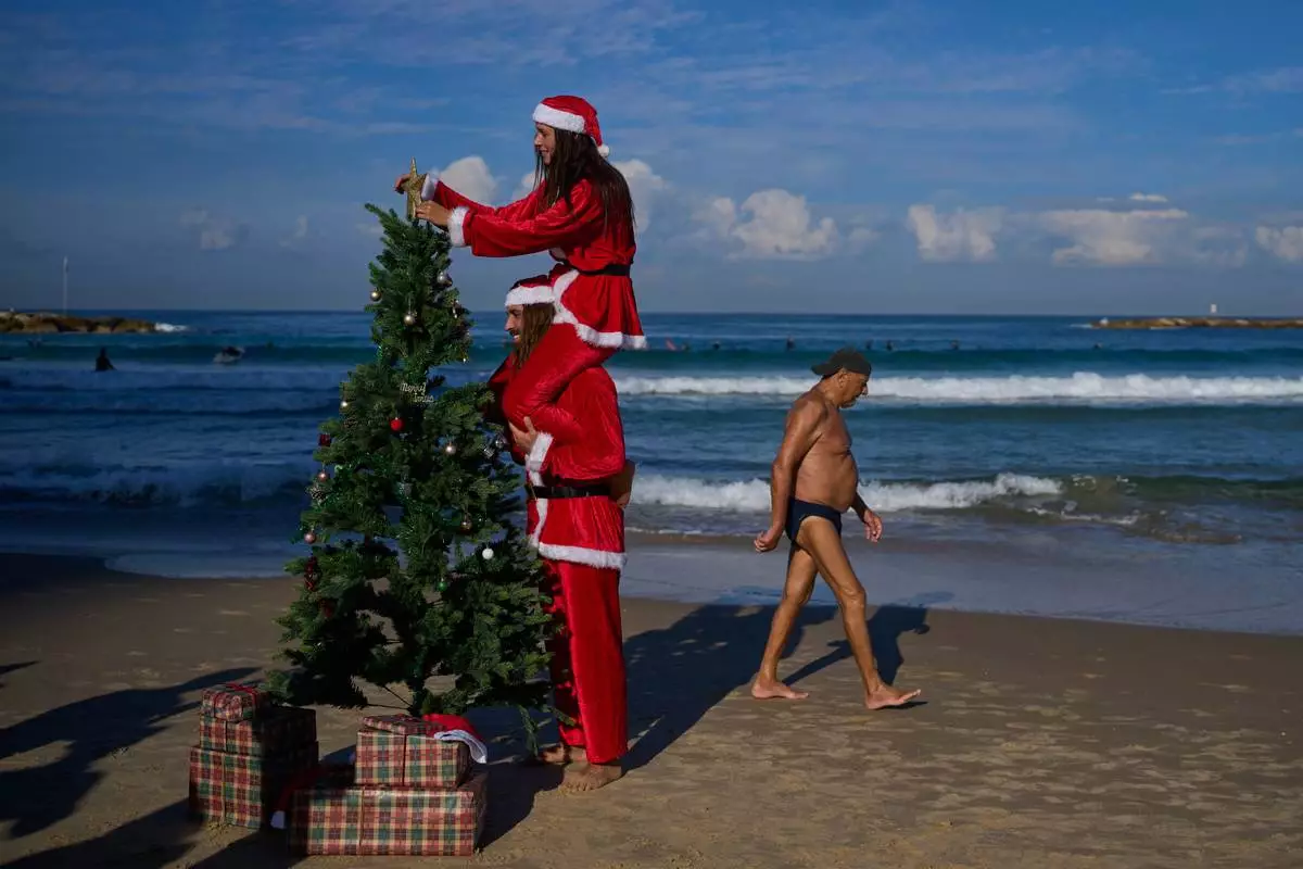 Surfers dressed as Santa Claus decorate a Christmas tree on the beach while filming a tourism advertisement ahead of Christmas, in Tel Aviv, Israel, Tuesday, Dec. 2, 2025. (AP Photo/Ohad Zwigenberg)