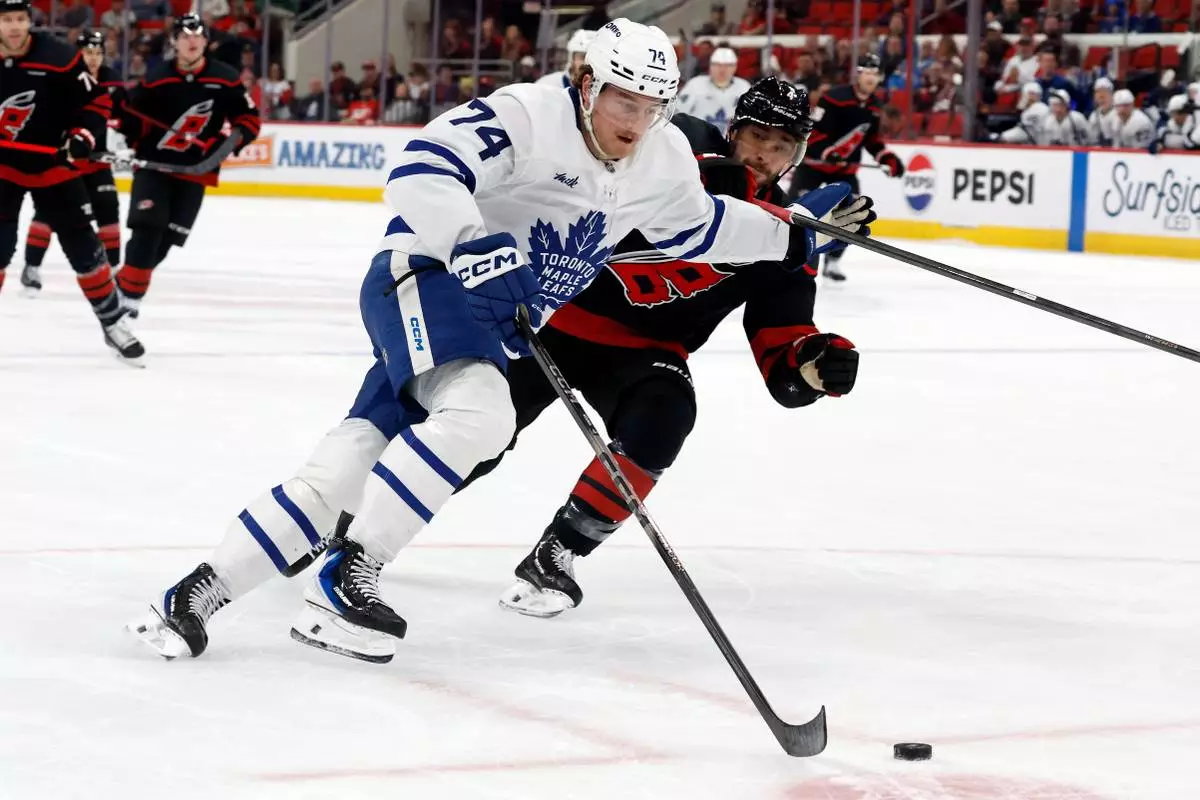 Toronto Maple Leafs' Bobby McMann (74) breaks down the ice with the puck after taking it from Carolina Hurricanes' Shayne Gostisbehere (4) to shoot an empty net goal during the third period of an NHL hockey game in Raleigh, N.C., Thursday, Dec. 4, 2025. (AP Photo/Karl DeBlaker)