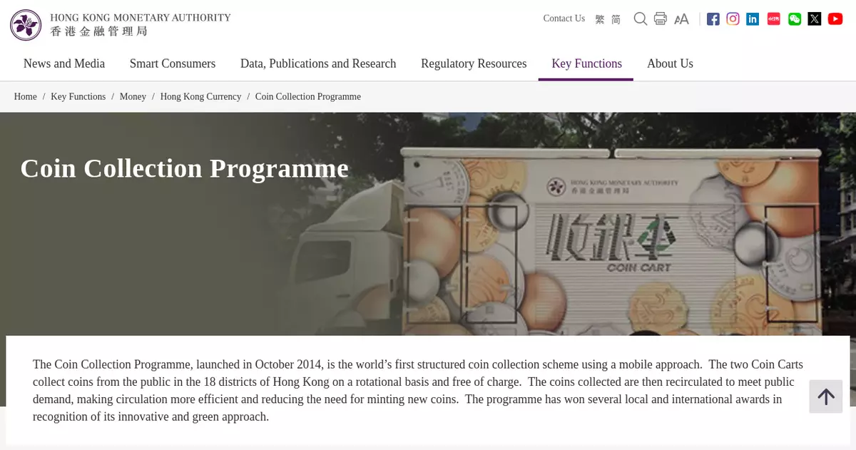 The Hong Kong Monetary Authority (HKMA) today (December 10) announced a new service schedule of the two "Coin Carts" under the Coin Collection Programme, for the period of January5, 2026 up to March22, 2026. The schedule and other details of the Programme are shown on the HKMA webpage (coincollection.hkma.gov.hk).