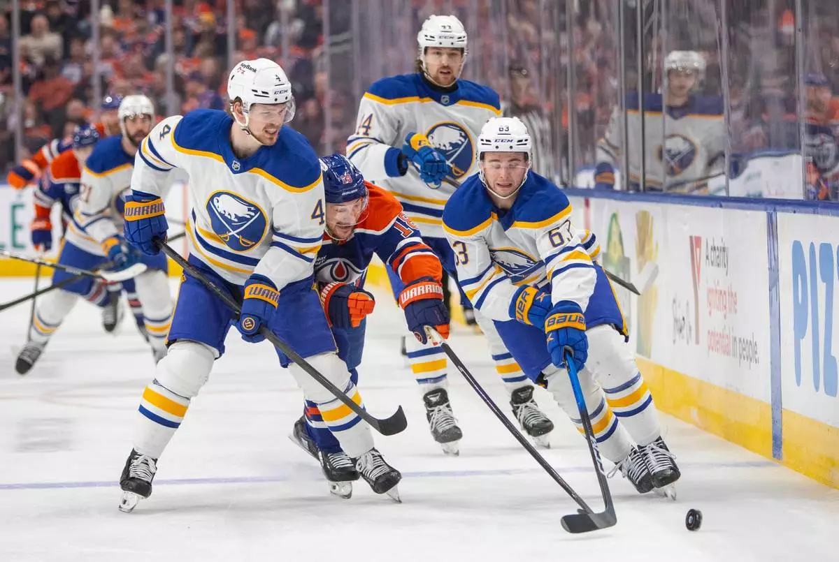 Buffalo Sabres b63, Bowen Byram (4) and Josh Dunne (44) outmaneuver Edmonton Oilers Zach Hyman (18) during second period NHL action in Edmonton, Tuesday, Dec. 9, 2025. (Amber Bracken/The Canadian Press via AP)