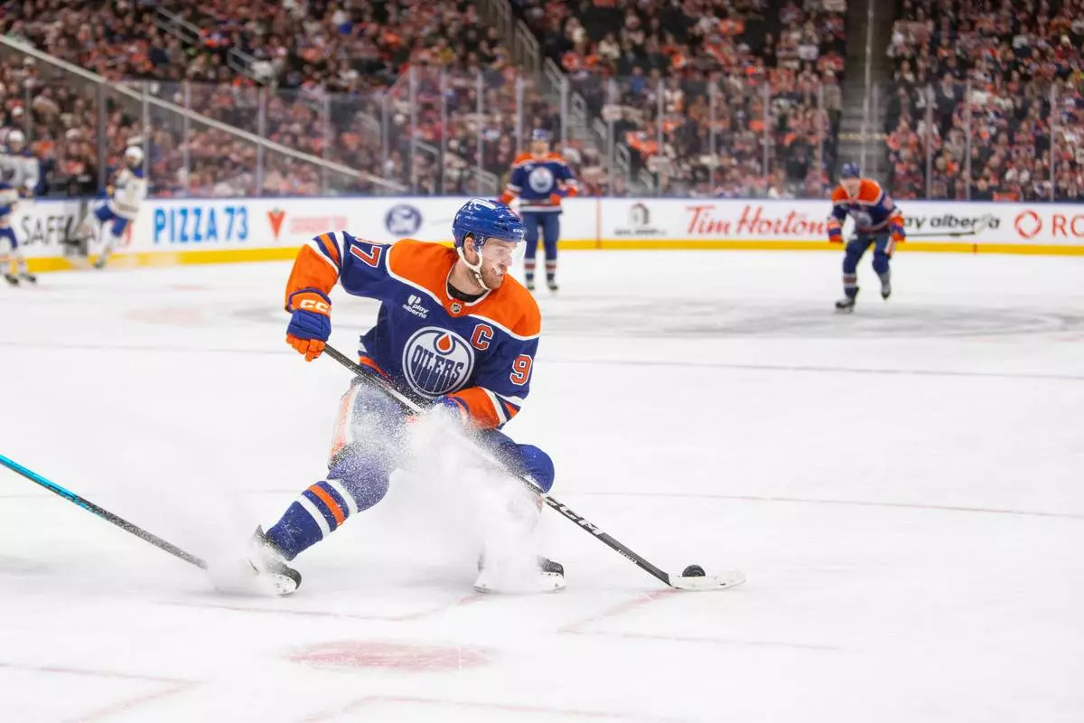 Edmonton Oilers Connor McDavid moves the puck during the second period of an NHL hockey game in Edmonton, Alberta, Tuesday, Dec. 9, 2025. (Amber Bracken/The Canadian Press via AP)