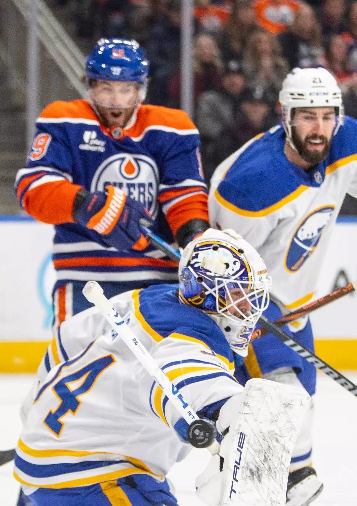 Buffalo Sabres goalie Alex Lyon (34) bats the puck away as Edmonton Oilers Adam Henrique (19) and Conor Timmins (21) look on during second period NHL action in Edmonton, Tuesday, Dec. 9, 2025. (Amber Bracken/The Canadian Press via AP)
