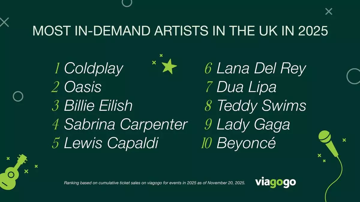 Coldplay were the most in-demand artists of 2025, drawing more fans across the UK and worldwide than any other act. International audiences flocked to see them on their home turf, making Coldplay the year’s top live event for overseas fans.