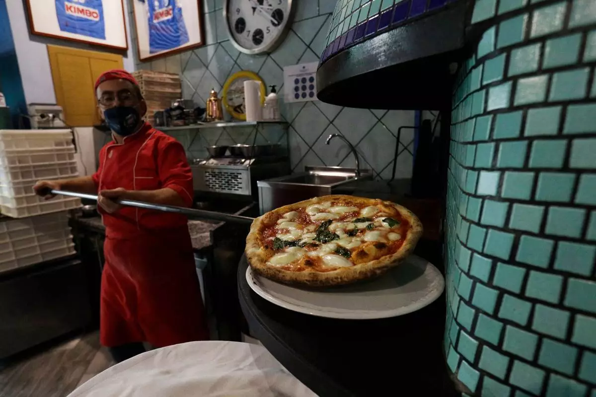 FILE -Eugenio Iorio bakes a pizza at a restaurant in Naples, Italy, Saturday, Nov. 14, 2020. (AP Photo/Gregorio Borgia, File)