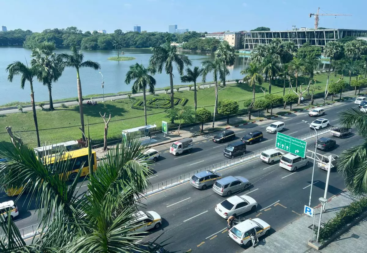A high-angle view of a busy road with famous Inya Lake in the background in Yangon, Myanmar, Wednesday, Dec. 10, 2025. (AP Photo)