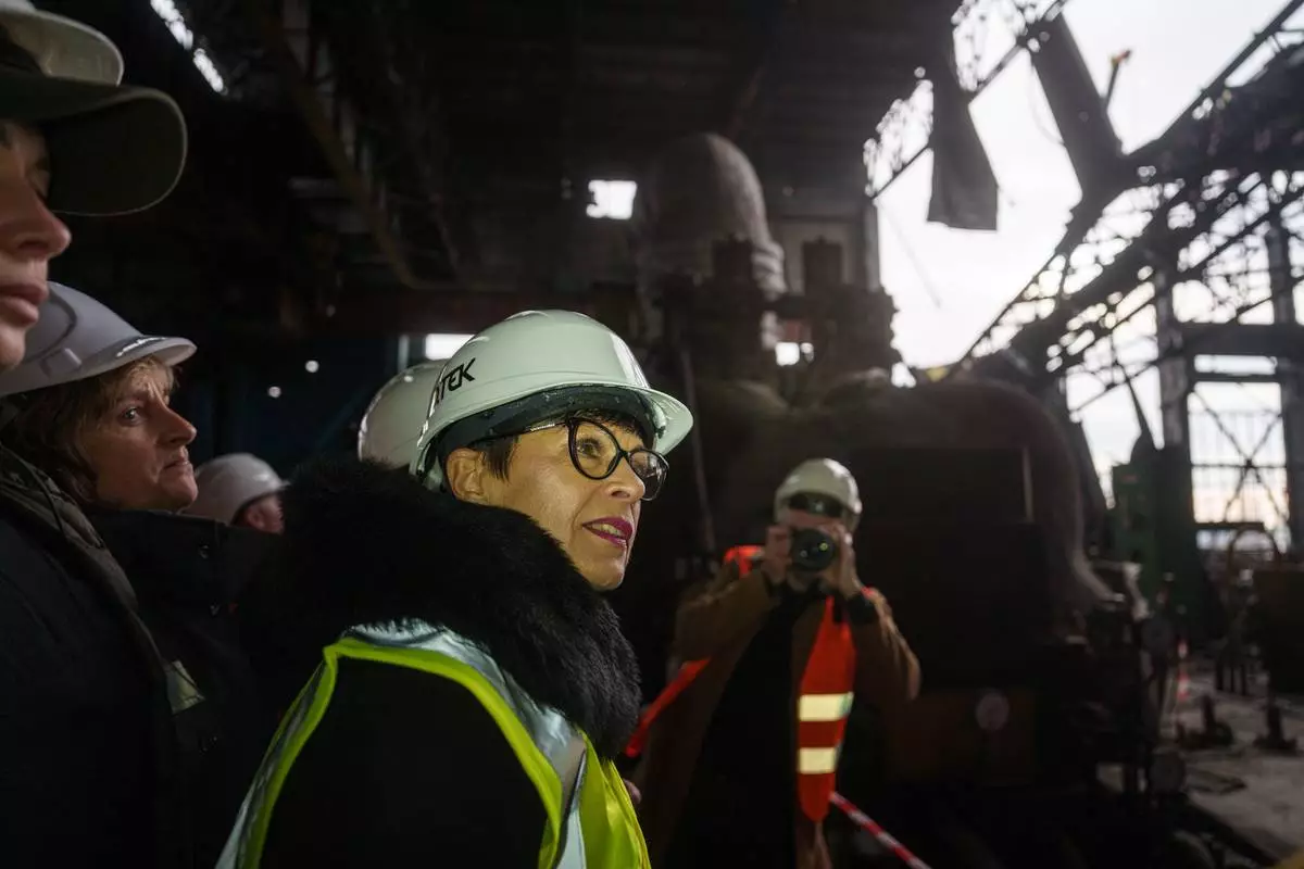 EU Commissioner for Enlargement Marta Kos, front, looks at a production hall damaged after a recent Russian missile attack at DTEK's power plant in Ukraine, on Wednesday, Dec. 10, 2025. (AP Photo/Evgeniy Maloletka)