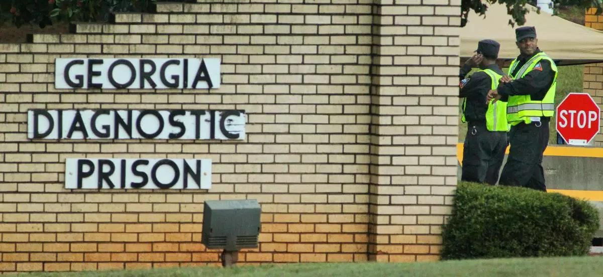 FILE - Guards stand at the front of Georgia Diagnostic Prison, Wednesday, Sept. 21, 2011, in Jackson, Ga. (John Spink/Atlanta Journal-Constitution via AP, File)