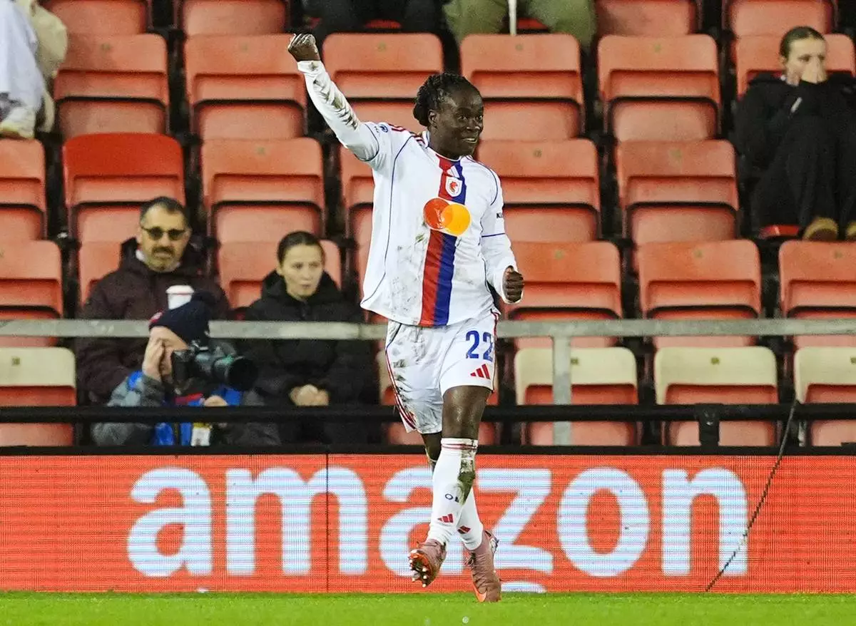 OL Lyonnes' Tabitha Chawinga celebrates scoring their side's first goal during a women's Champions League soccer match against Manchester United, Wednesday, Dec. 10, 2025, in Leigh, England. (Martin Rickett/PA via AP)
