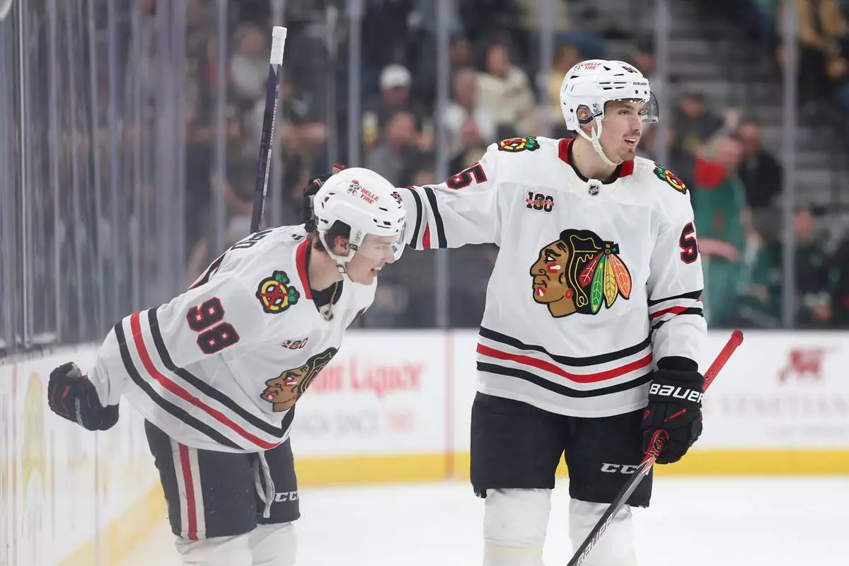 Chicago Blackhawks center Connor Bedard (98) and defenseman Artyom Levshunov (55) celebrate after Bedard's goal against the Vegas Golden Knights during the third period of an NHL hockey game Tuesday, Dec. 2, 2025, in Las Vegas. (AP Photo/Ian Maule)