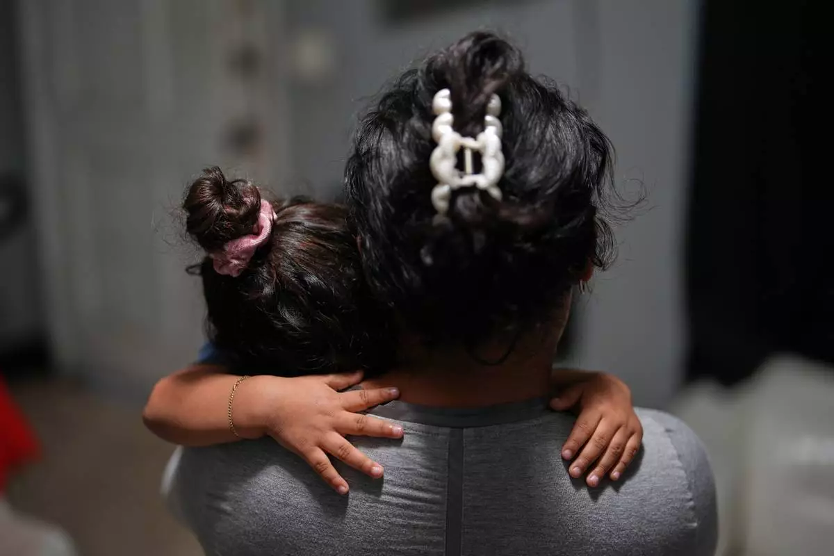 Jakelin Pasedo, 39, hugs her five-year-old son inside the Miami-area motel room where she lives with her two children, who all have refugee status, Wednesday, Oct. 22, 2025, after their father requested to be sent back to Venezuela after months in immigration detention. (AP Photo/Rebecca Blackwell)