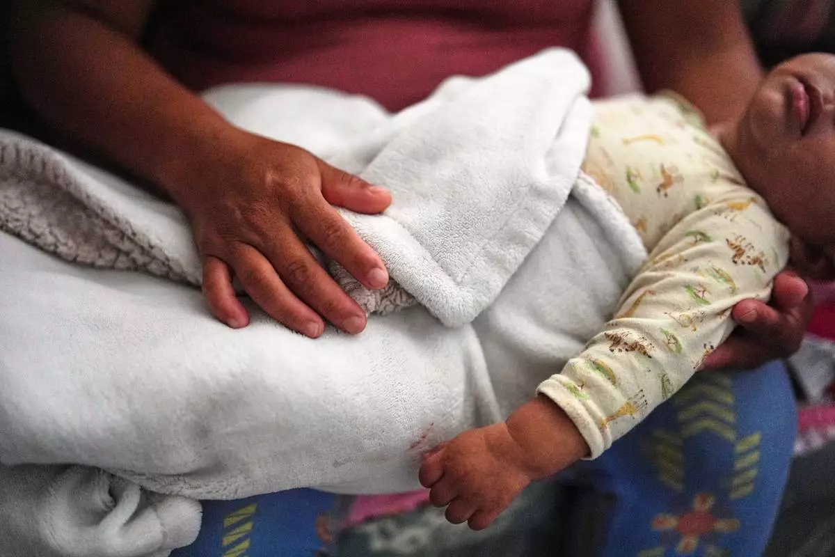 Guatemalan migrant Amavilia, 31, holds her infant son, whose father Edgar was detained days after his birth and later deported to Guatemala, inside the South Florida apartment where she lives with her two children and a roommate, Wednesday, Oct. 8, 2025. (AP Photo/Rebecca Blackwell)