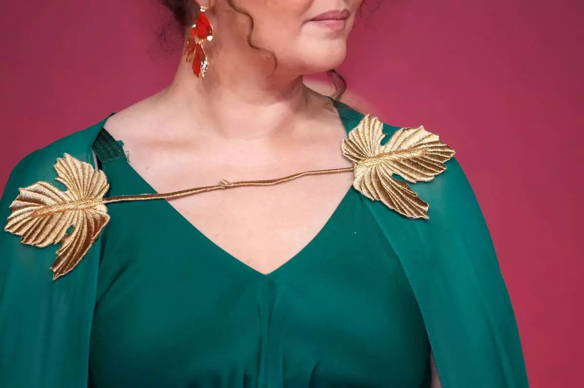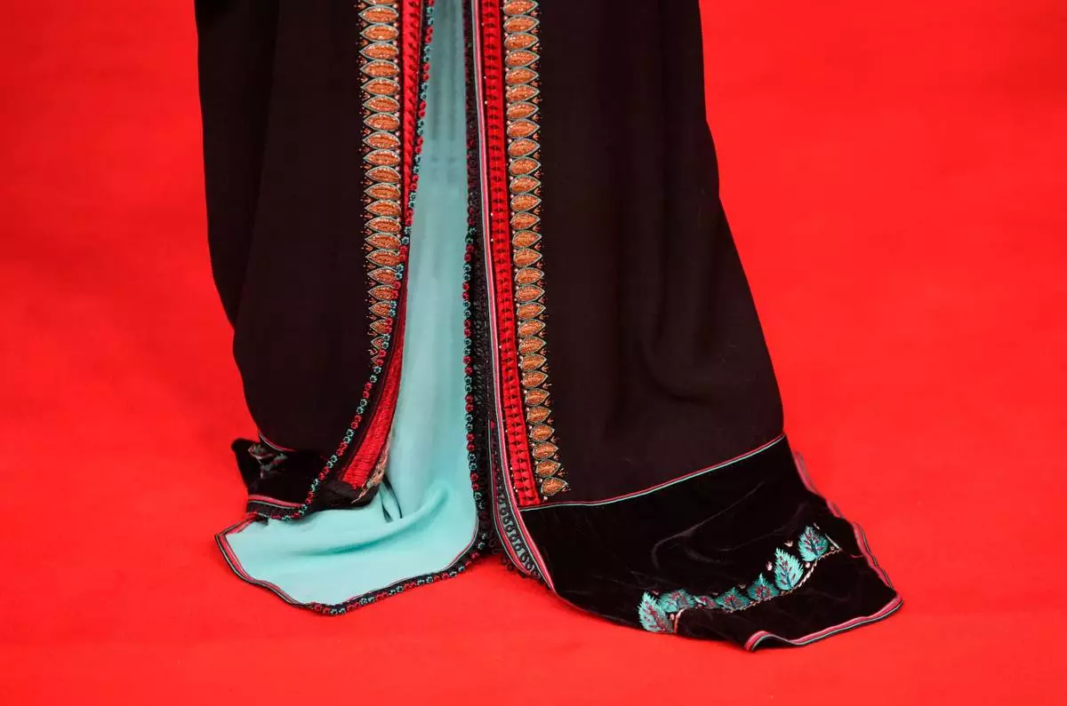 Some ensembles nodded explicitly to the region: hand-stitched caftans and robes with hems that followed the geometry of North African embroidery. Youssra, one of Egypt’s best-known actors, carried a black sequined, pearl-trimmed clutch emblazoned with her name across the front, recognizable to audiences all over the Middle East.