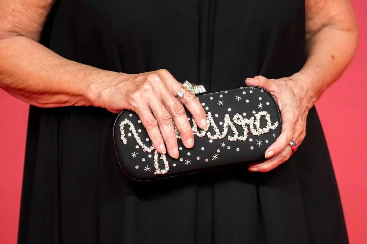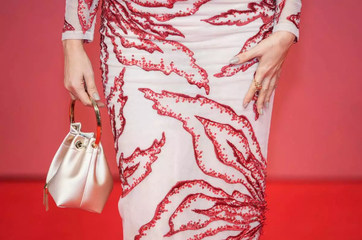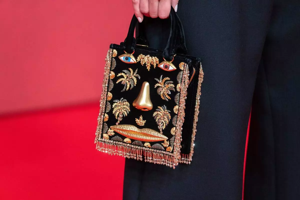 An actress holds a Schiaparelli purse while posing for a photo on the red carpet during 22nd Marrakech Film Festival, in Morocco, Tuesday, Dec. 2, 2025. (AP Photo/Mosa'ab Elshamy)