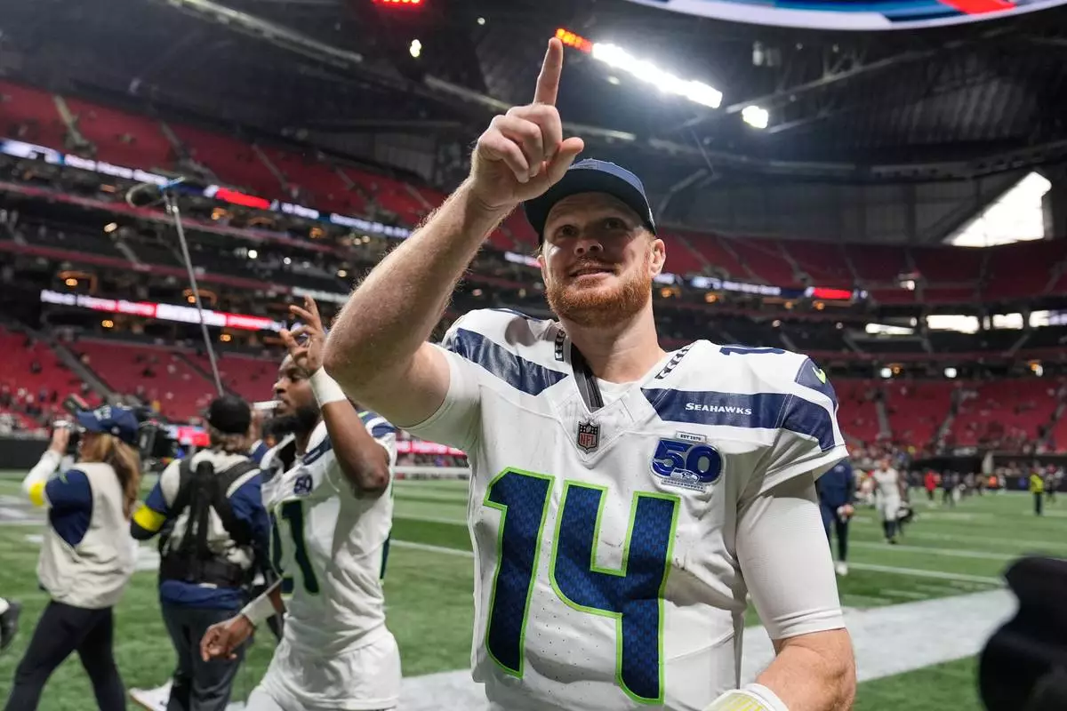 Seattle Seahawks quarterback Sam Darnold points to fans after a victory over the Atlanta Falcons in an NFL football game, Sunday, Dec. 7, 2025, in Atlanta. (AP Photo/Brynn Anderson)