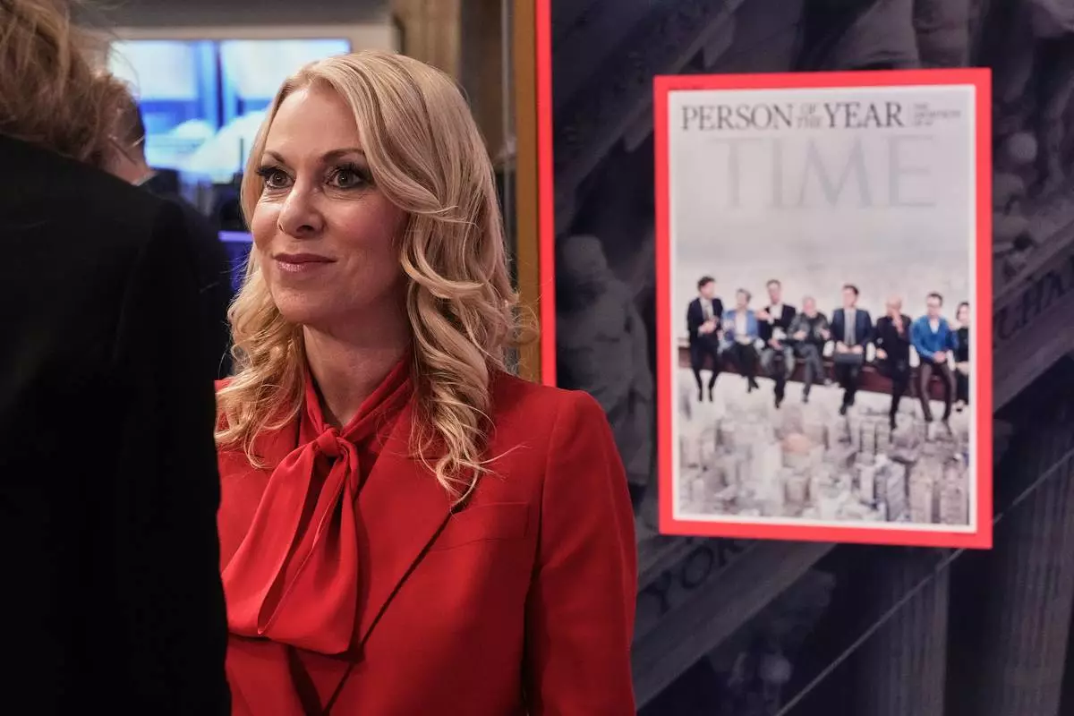 TIME CEO Jessica Sibley is interviewed on the floor of the New York Stock Exchange, adjacent to TIME's "Person of the Year" cover, Thursday, Dec. 11, 2025. (AP Photo/Richard Drew)