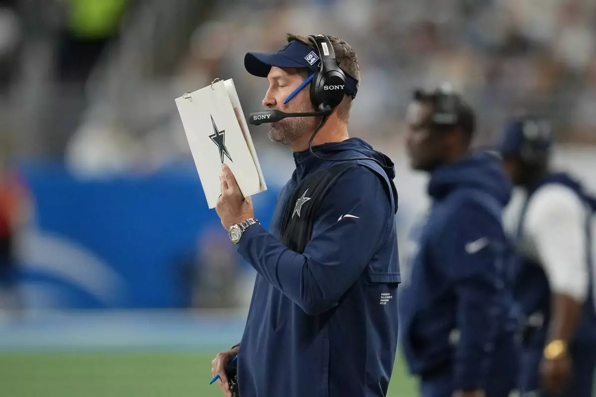 Dallas Cowboys head coach Brian Schottenheimer looks at a playbook during the first half of an NFL football game against the Detroit Lions Thursday, Dec. 4, 2025, in Detroit. (AP Photo/Paul Sancya)