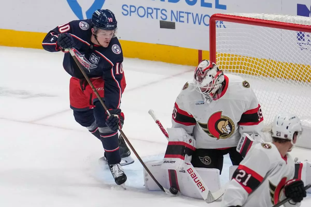 Columbus Blue Jackets left wing Dmitri Voronkov (10) reaches for the puck next to Ottawa Senators goaltender Linus Ullmark (35) in the first period of an NHL hockey game Thursday, Dec. 11, 2025, in Columbus, Ohio. (AP Photo/Sue Ogrocki)
