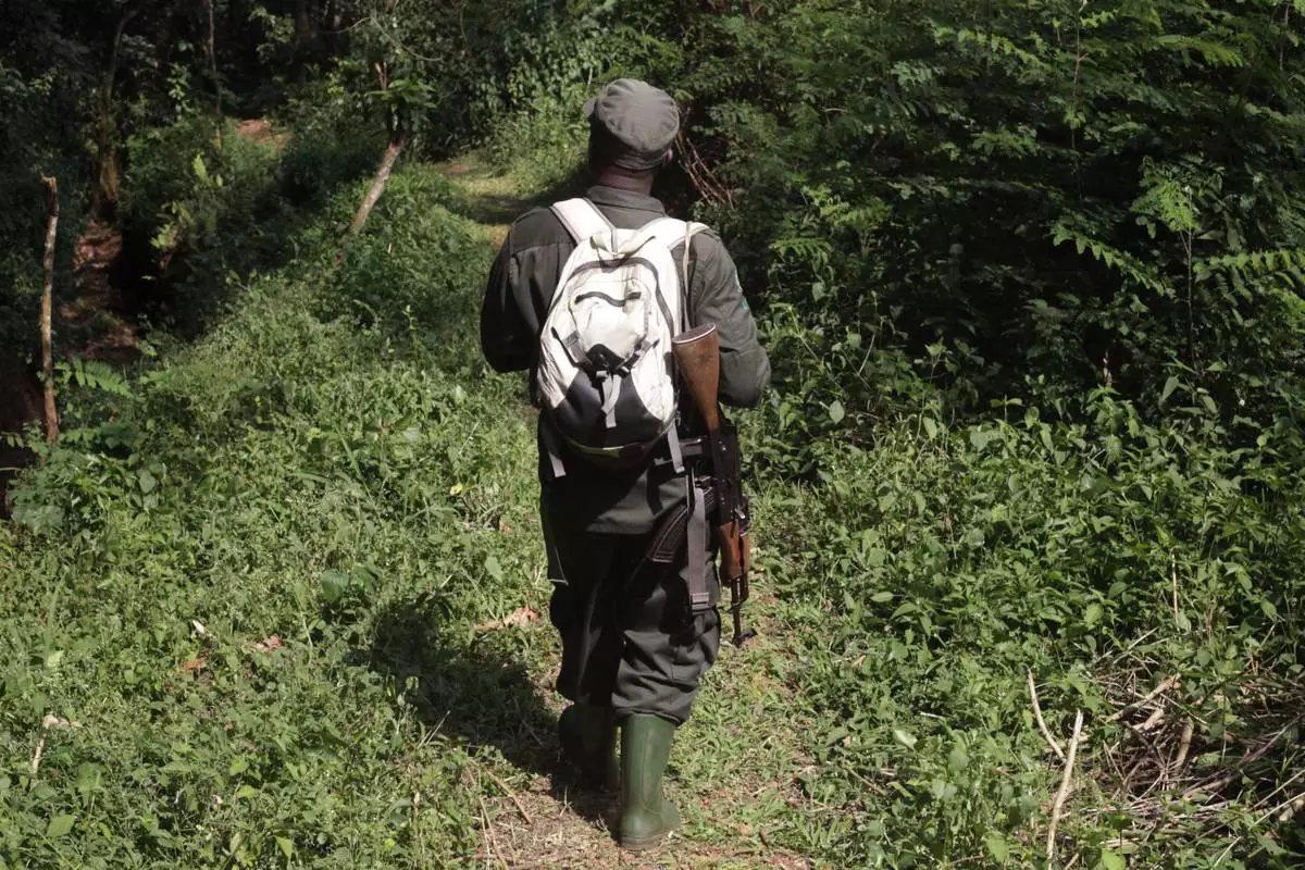 KIBALE NATIONAL PARK, Uganda (AP) — The man tracking chimpanzee movements in a rainforest is required to follow the primates wherever they go — except up in the trees.