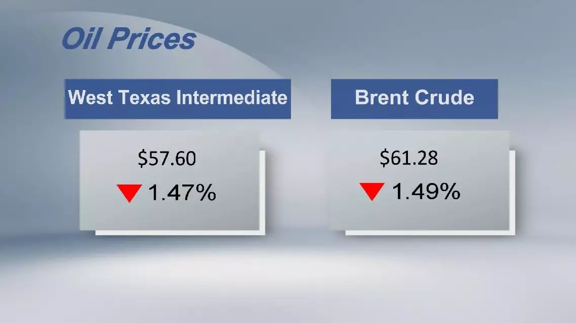 The West Texas Intermediate for January delivery dropped 86 cents, or 1.47 percent, to settle at 57.6 U.S. dollars a barrel on the New York Mercantile Exchange. Brent crude for February delivery decreased by 93 cents, or 1.49 percent, to 61.28 dollars a barrel on the London ICE Futures Exchange.