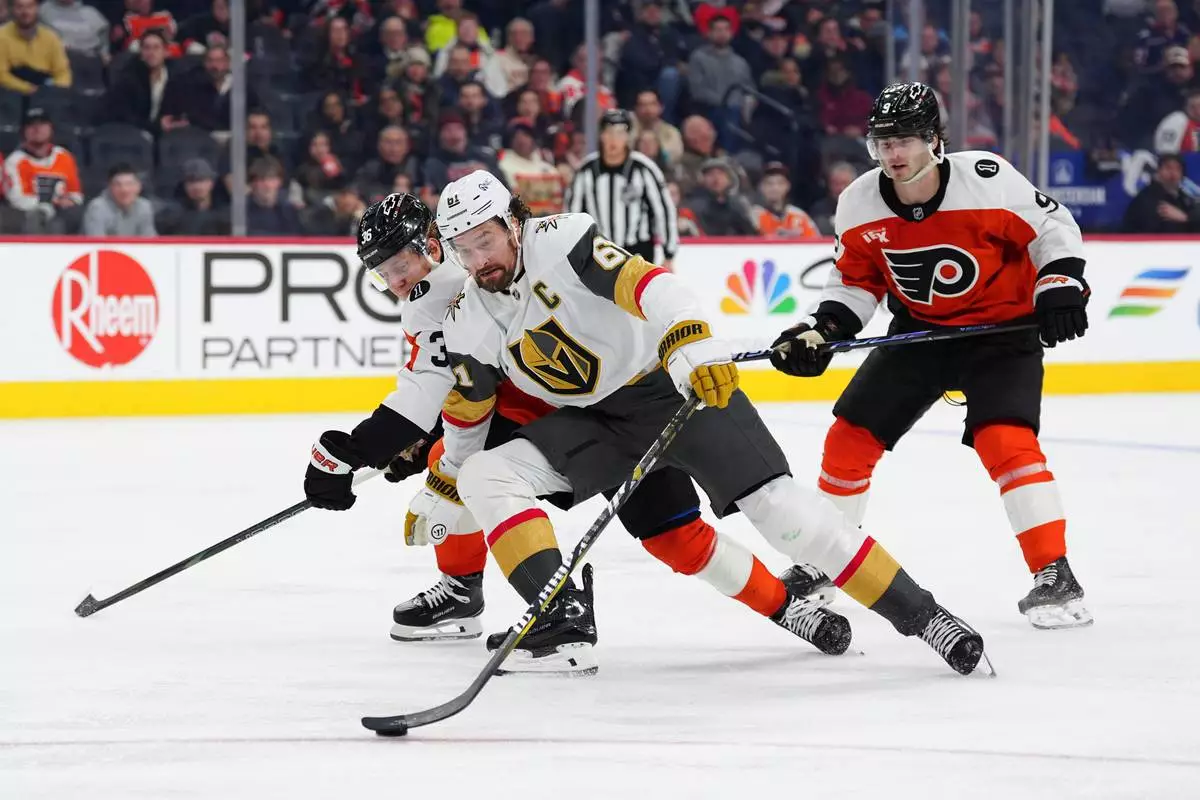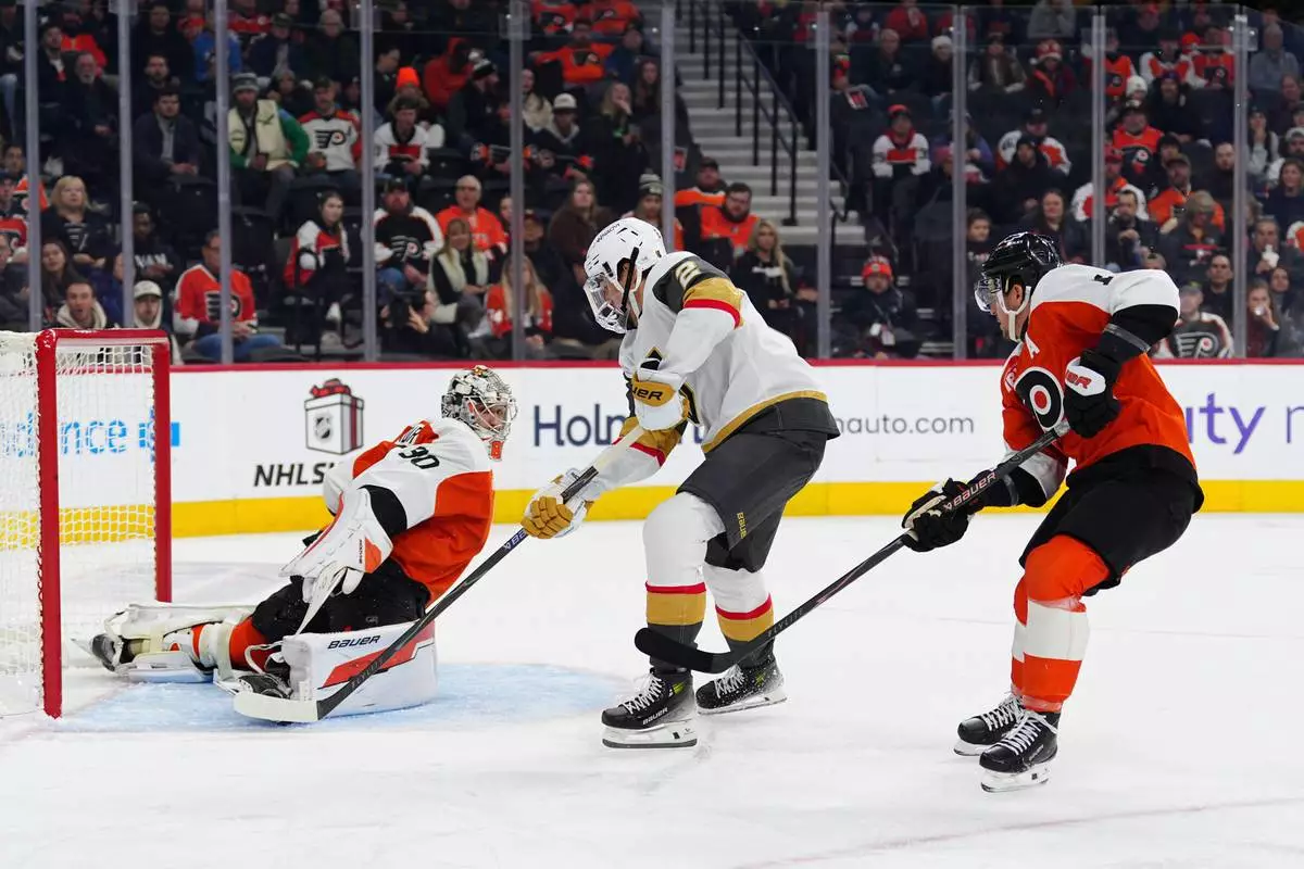 The winning goal was a partial gift, as Philadelphia’s Travis Konecny flubbed an attempted outlet pass near the Flyers net, allowing Vegas star Jack Eichel to take possession and then feed an onrushing Stone.