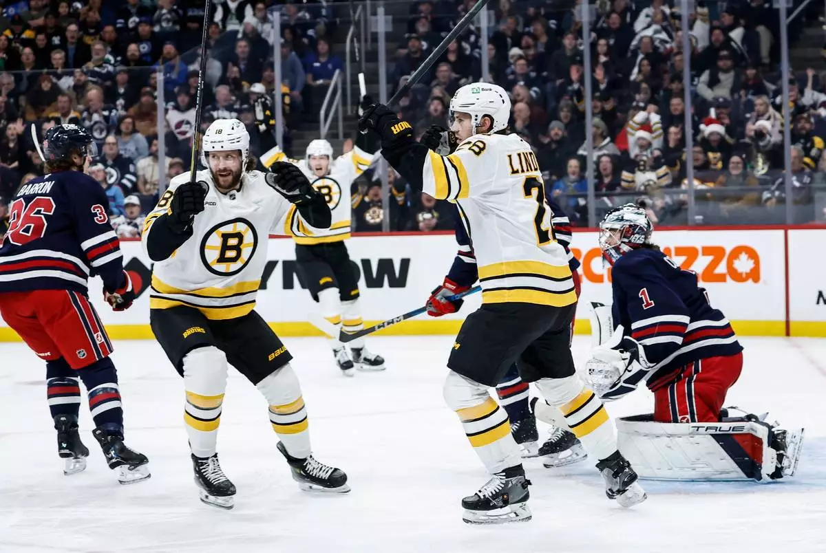 Boston Bruins players celebrate Elias Lindholm's (28) goal against the Winnipeg Jets during the third period of of an NHL hockey game, in Winnipeg, Manitoba, Thursday, Dec. 11, 2025. (John Woods/The Canadian Press via AP)
