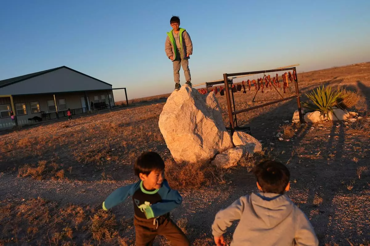 Young members of the Mayflower Church community play outside near pork belly strips curing on a pole to make a traditional Chinese bacon known as là ròu, in Midland, Texas, Jan. 18, 2025. (AP Photo/Rebecca Blackwell)
