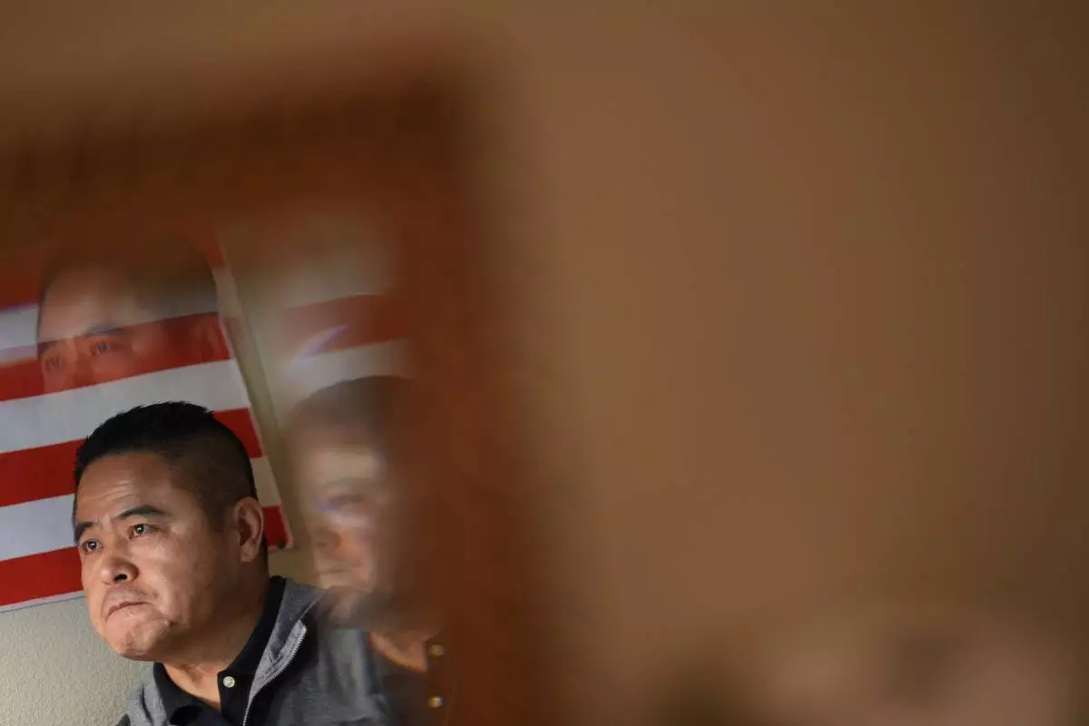 Former Chinese official Li Chuanliang is reflected in a mirror as he films a YouTube broadcast in his room alongside an American flag in the Mayflower Church community in Midland, Texas, Jan. 18, 2025. (AP Photo/Rebecca Blackwell)