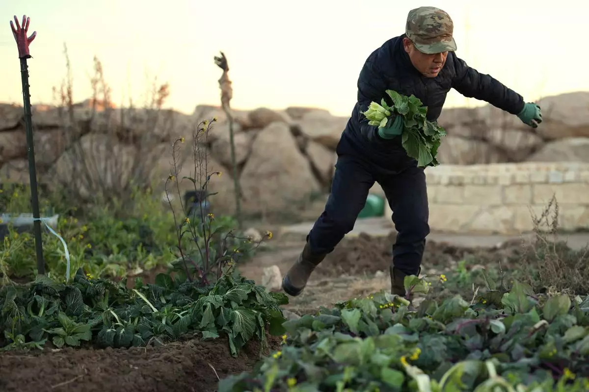 Former Chinese official Li Chuanliang harvests greens from a vegetable garden inside the Mayflower Church community in Midland, Texas, Jan. 19, 2025. (AP Photo/Rebecca Blackwell)