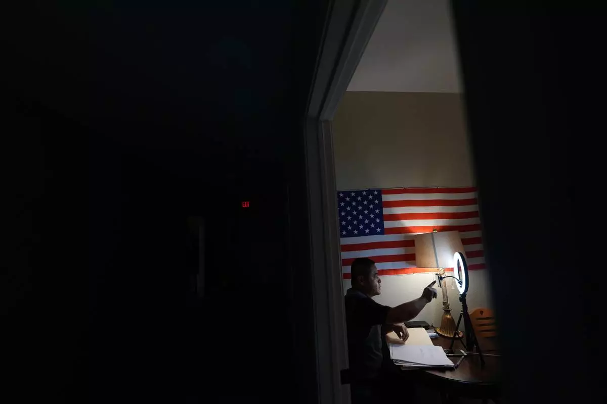 Former Chinese official Li Chuanliang films a YouTube broadcast from the Mayflower Church community in Midland, Texas, Jan. 18, 2025. (AP Photo/Rebecca Blackwell)