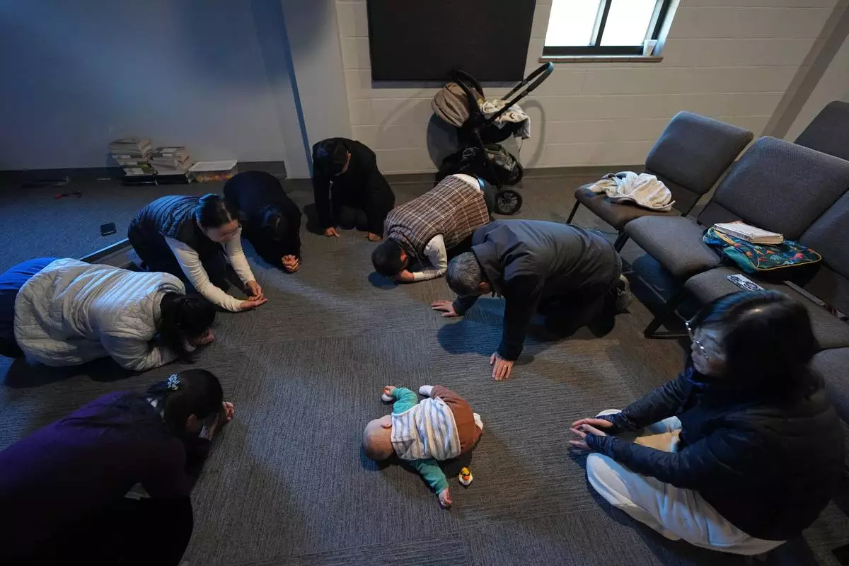 Members of the Mayflower Church, a Christian community which fled religious persecution in China, pray at a church in Midland, Texas, Jan. 19, 2025. (AP Photo/Rebecca Blackwell)