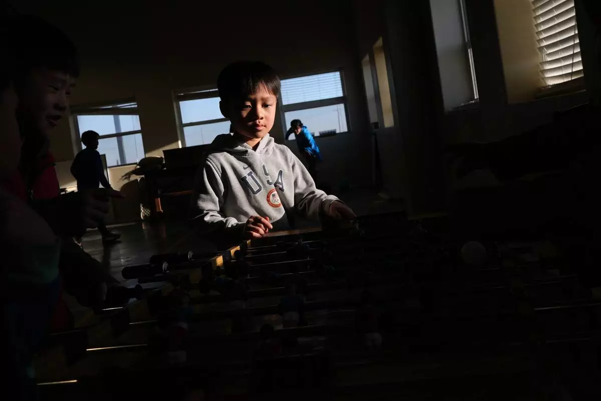 Nong Yitan plays foosball with other Mayflower Church kids inside the community hall in Midland, Texas, Jan. 18, 2025. (AP Photo/Rebecca Blackwell)