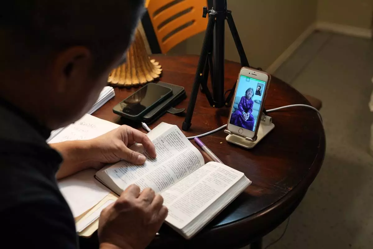 Former Chinese official Li Chuanliang reads the Bible to his elderly mother, Shen Shuzi, who is back in China, over a video call in Midland, Texas, Jan. 18, 2025. (AP Photo/Rebecca Blackwell)