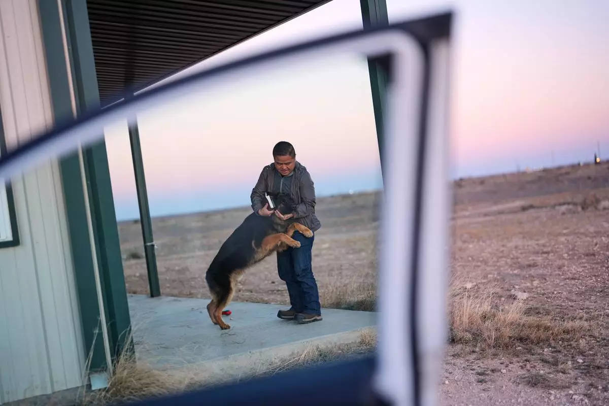Former Chinese official Li Chuanliang greets his German shepherd, Hardy, as he returns from a trip to town from the Mayflower Church community in Midland, Texas, Jan. 18, 2025. (AP Photo/Rebecca Blackwell)