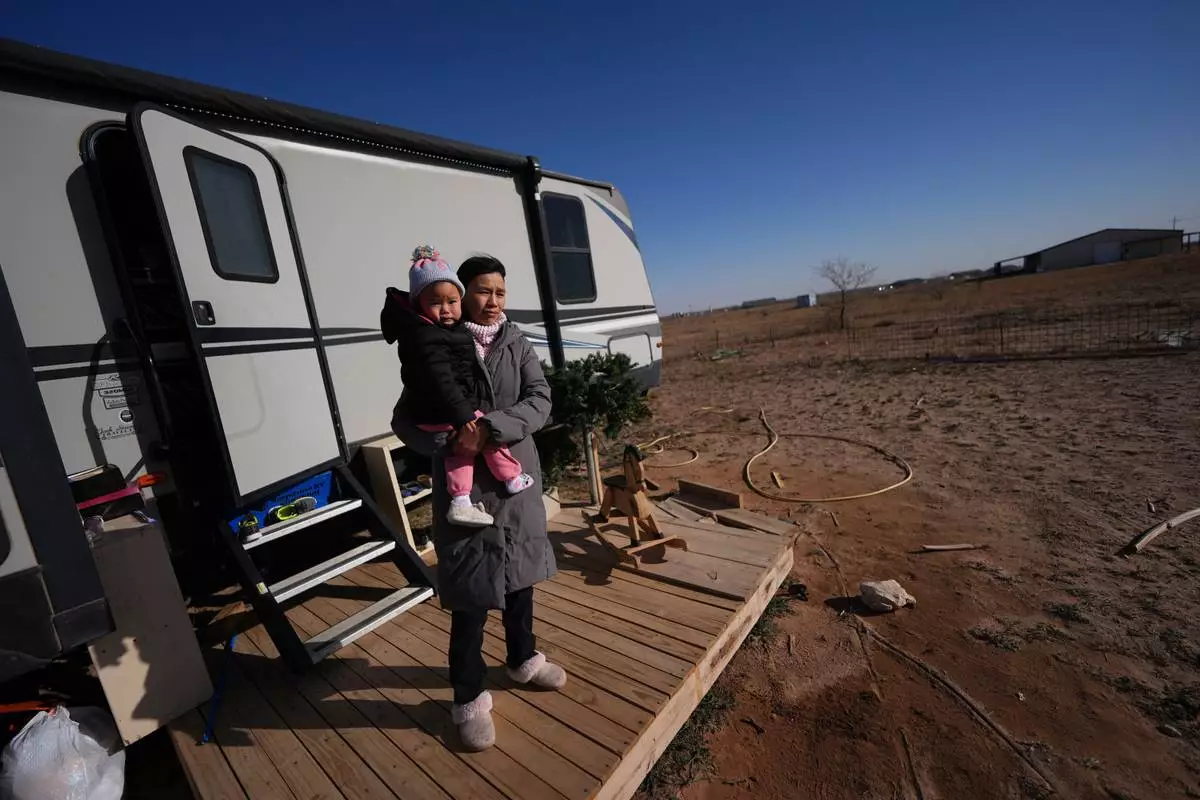 Mayflower Church member Chen Jingjing holds her daughter, Mo Nika, as she surveys the landscape from the porch of the family's trailer in Midland, Texas, Jan. 20, 2025. (AP Photo/Rebecca Blackwell)